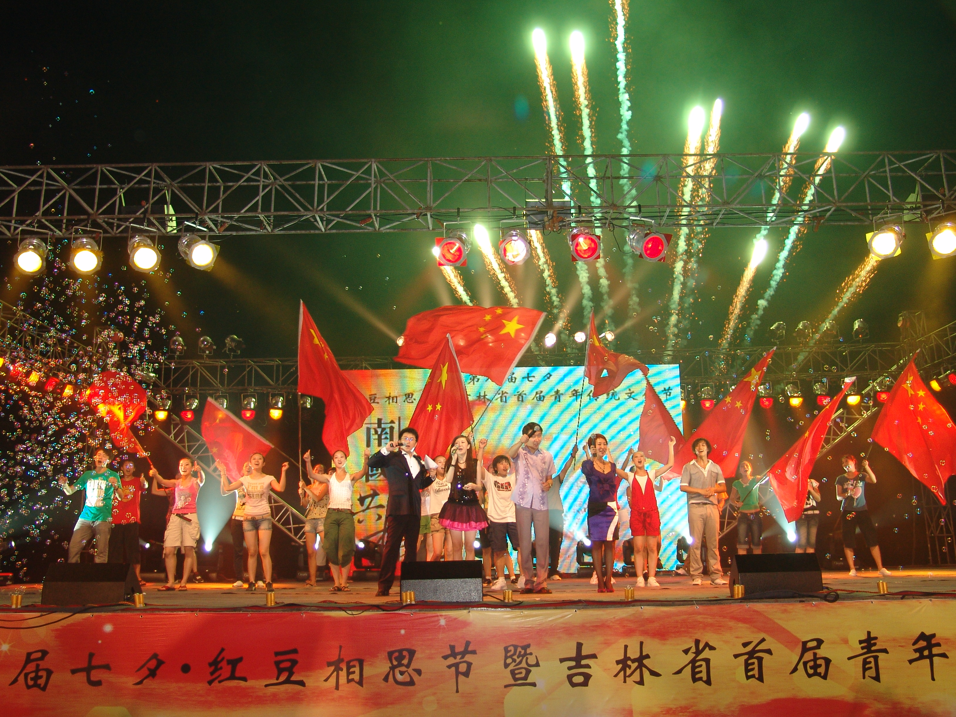 傳統(tǒng)七夕節(jié)(8月7日)這一天晚上,長春市文化廣場歌聲陣陣,音樂滿天,到處可見心形的氣球、鮮紅的玫瑰,一盞盞心愿燈緩緩升起,這里正在舉辦第八屆七夕·紅豆情人節(jié)暨吉林首屆青年傳統(tǒng)文化節(jié)。首推七夕·紅豆情人節(jié)的周耀庭在這次活動中高興地說“紅豆集團原本計劃要用5個5年的時間推廣七夕節(jié),但現(xiàn)在看來這個時間要提前了?!?這次活動由共青團吉林省委、吉林省青年聯(lián)合會、紅豆集團、吉林電視臺、城市晚報社、長春交通之聲共同舉辦,共青團吉林省委書記謝忠?guī)r,九屆、十屆全國人大代表、紅豆集團董事局主席周耀庭等領(lǐng)導出席了這次活動。文化廣場上人山人海,有20000多名長春市民積極自愿參加這次活動,快樂的度過了美麗的七夕。