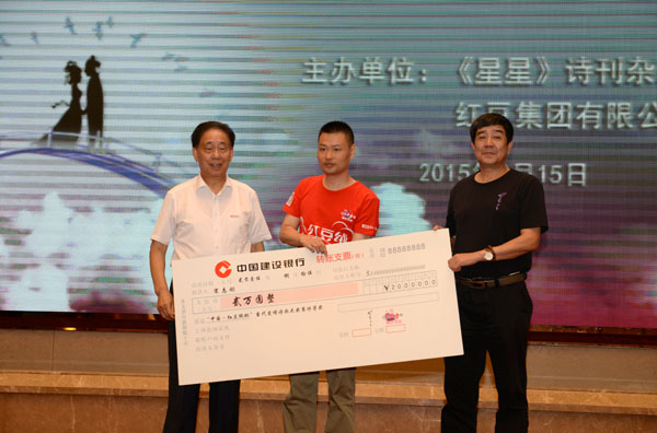 七夕傳真情,紅豆寄相思。8月15日,備受關(guān)注的“中國(guó)?紅豆絨杯”當(dāng)代愛(ài)情詩(shī)大獎(jiǎng)賽各項(xiàng)獎(jiǎng)在無(wú)錫紅豆杉莊正式揭曉,來(lái)自湖南長(zhǎng)沙的宋志剛以組詩(shī)《紅豆,那顆磅礴的心跳》在4.62萬(wàn)首投稿詩(shī)作中脫穎而出,獲得特等獎(jiǎng)。胡云昌等60多位作者分獲一、二等獎(jiǎng)、優(yōu)秀作品獎(jiǎng)和校園詩(shī)作獎(jiǎng)。
