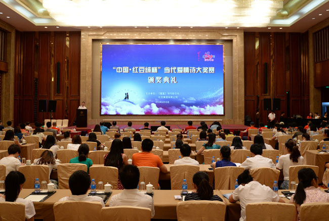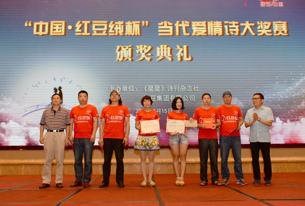 為了進(jìn)一步繁榮愛(ài)情詩(shī)創(chuàng)作,弘揚(yáng)正確愛(ài)情觀,特別是推動(dòng)中國(guó)當(dāng)代愛(ài)情詩(shī)再度輝煌,2014年7月1日,由《星星》詩(shī)刊雜志社與紅豆集團(tuán)聯(lián)合啟動(dòng)了“中國(guó)?紅豆絨杯”當(dāng)代愛(ài)情詩(shī)大獎(jiǎng)賽征文活動(dòng),作為紅豆七夕節(jié)的一項(xiàng)重要活動(dòng)?,F(xiàn)在經(jīng)過(guò)一年的征集及后期評(píng)選,在今年七夕——中國(guó)情人節(jié)前夕頒獎(jiǎng)。