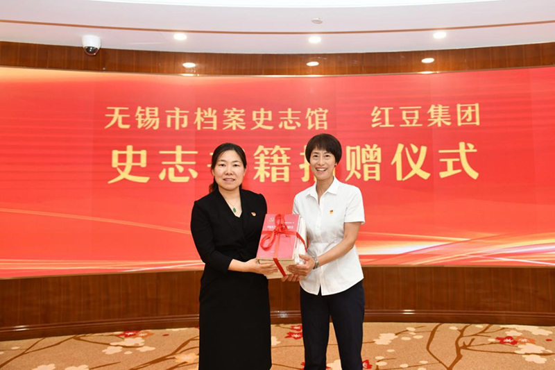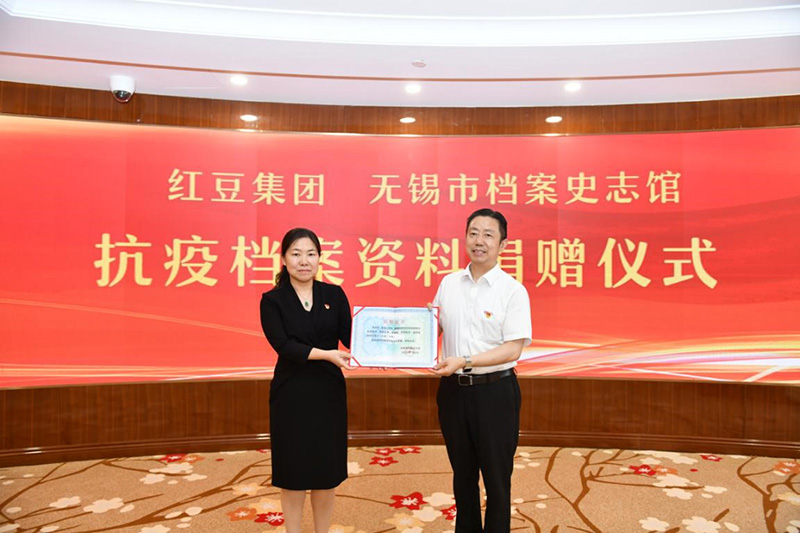 近年來,無錫市檔案史志館深挖無錫黨史地方志資源,潛心書寫紅色歷史,組織編撰地方黨史、地方志書籍,為全市黨員干部傳承革命精神,加強(qiáng)黨性教育提供了一批權(quán)威教材。捐贈(zèng)儀式上,無錫市檔案史志館向紅豆集團(tuán)捐贈(zèng)了無錫史志書籍。紅豆集團(tuán)向無錫市檔案史志館捐贈(zèng)了紅豆的抗疫史料及紅豆秒改設(shè)備第一時(shí)間生產(chǎn)的首批抗疫產(chǎn)品。隨后,宗翡代表無錫市檔案史志館為周海江和紅豆集團(tuán)發(fā)放了捐贈(zèng)證書。